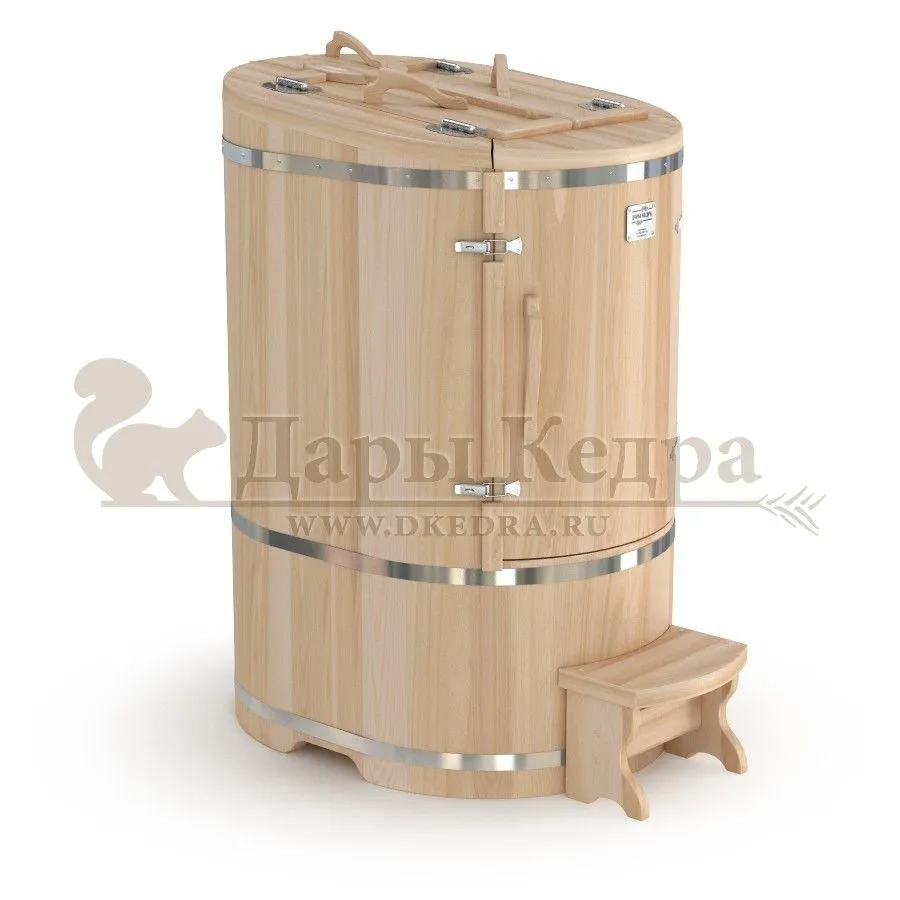 Овальная фитобочка из кедра - это мини парная, которую можно использовать не только в спа-салонах, но и дома. Овальная модель более просторна и удобна в использовании. Толщина стенок составляет 40-45 мм, что позволяет увеличить срок службы изделия. Верхний скос делает положение головы более комфортным и улучшает обзор. Она оборудована откидными створками, дверцей и отверстием для головы. Во время парения человек сидит внутри кедровой бочки, а голова находится снаружи. Благодаря этому исключается возможность перегрева. Подлокотники из кедра, встроенные ручки на створках и двери делают эксплуатацию более удобной.