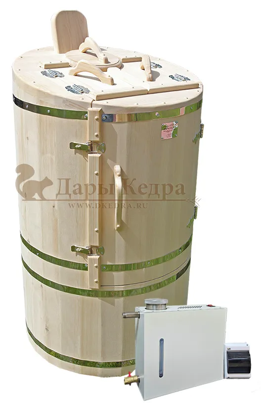 Готовый комплект - это полностью укомплектованный набор с фитобочкой для процедур парения. Круглая модель наиболее компактна и мобильна. Толщина стенок составляет 40-45 мм, что позволяет увеличить срок службы изделия. Бочка оборудована откидными створками, дверцей и отверстием для головы. Верхний скос делает положение головы более комфортным и улучшает обзор. Во время парения человек сидит внутри кедровой бочки, а голова находится снаружи. Благодаря этому исключается возможность перегрева. Подлокотники из кедра, встроенные ручки на створках и двери делают эксплуатацию более удобной.