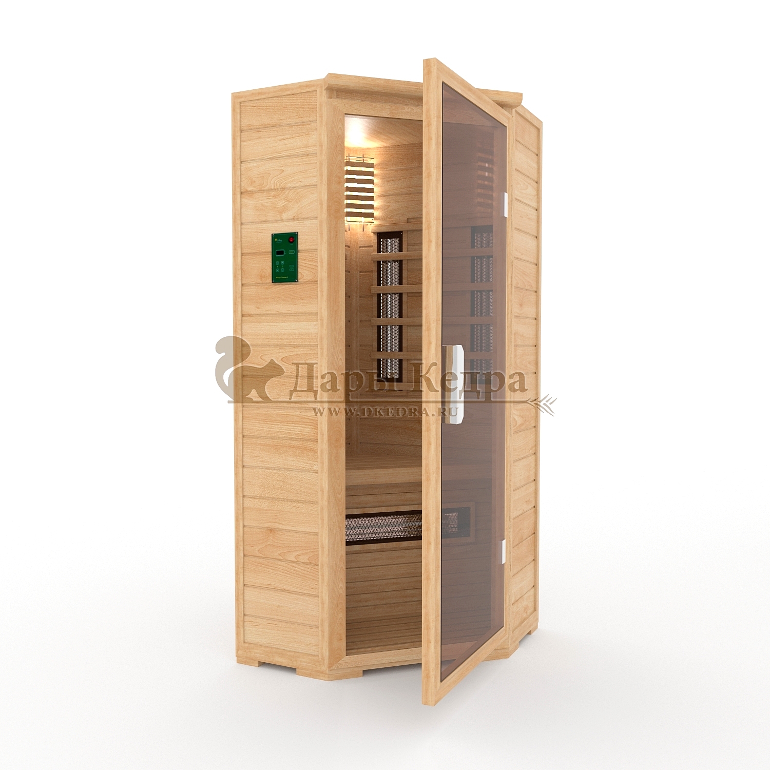 Двухместная угловая инфракрасная сауна кабина из кедра и липы с керамическими излучателями Это специально оборудованная кабина из липы для прогрева тела человека сухим теплом. Воздух в таких парных не нагревается. Инфракрасные лучи воздействуют на тело, равномерно прогревая мышцы, суставы и органы. Керамические излучатели похожи на лампы, имеют высокую температуру нагрева, поэтому защищены противоожоговыми решетками. Тело человека в таких саунах нагревается интенсивнее. Работает кабина за счет электричества. Установка сауны в угол, позволяет рационально использовать пространство помещения. Подходит как для домашнего использования, так и для коммерции. Обращаем Ваше внимание что в стандартную комплектацию входит трапик для ног, но вы можете его заменить на цельный пол совершенно бесплатно! Целебная древесина кедра и инфракрасные лучи благотворно влияют на организм человека в целом. При регулярном использовании инфракрасной сауны укрепляется иммунитет, улучшается кровообращение и состояние кожи, выводятся токсины.