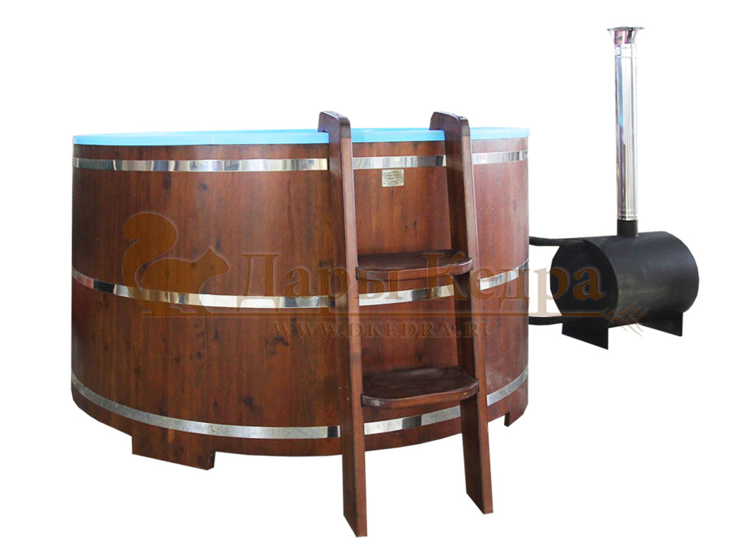 Это уличная подогреваемая купель с круглой внутренней чашей из термопластика. Для удобства пользования купель оборудована лавочками, приставной и внутренней лестницей. Подогрев воды осуществляется за счет внешней печи с дымоходом. Термопластик устойчив к воздействию температур, облегчает уход за фурако и увеличивает срок ее службы.