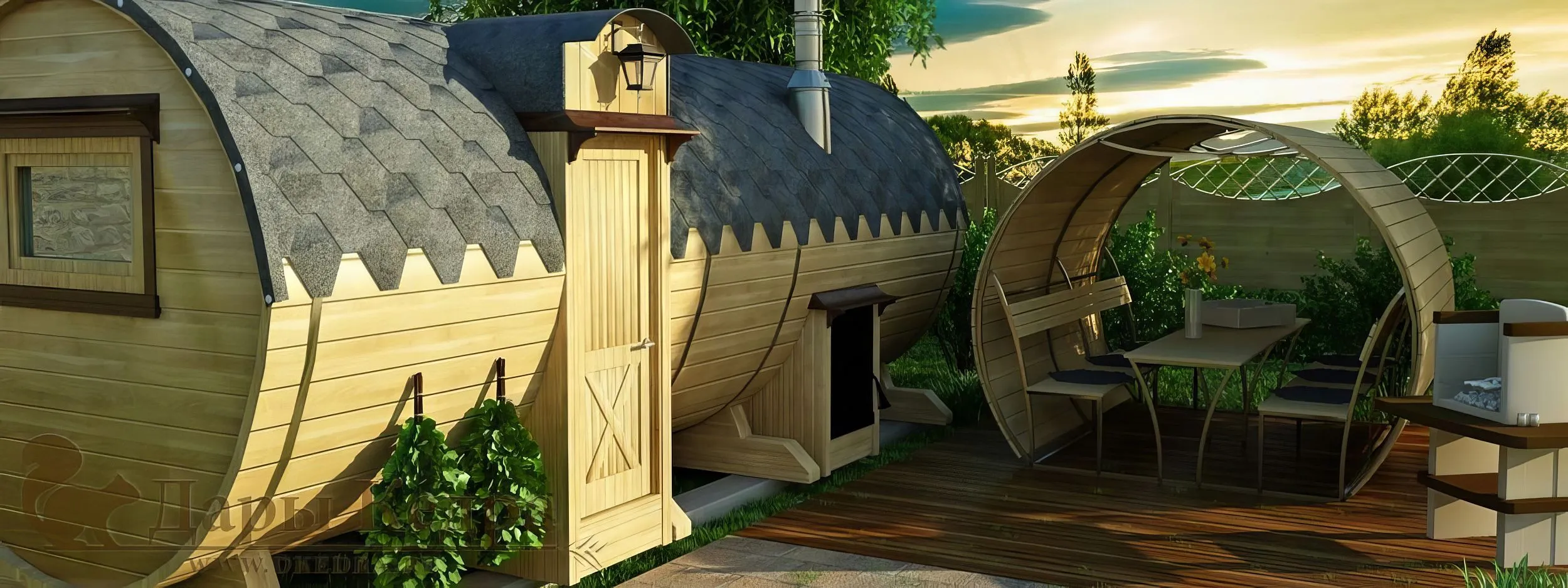 Круглая баня с беседкой