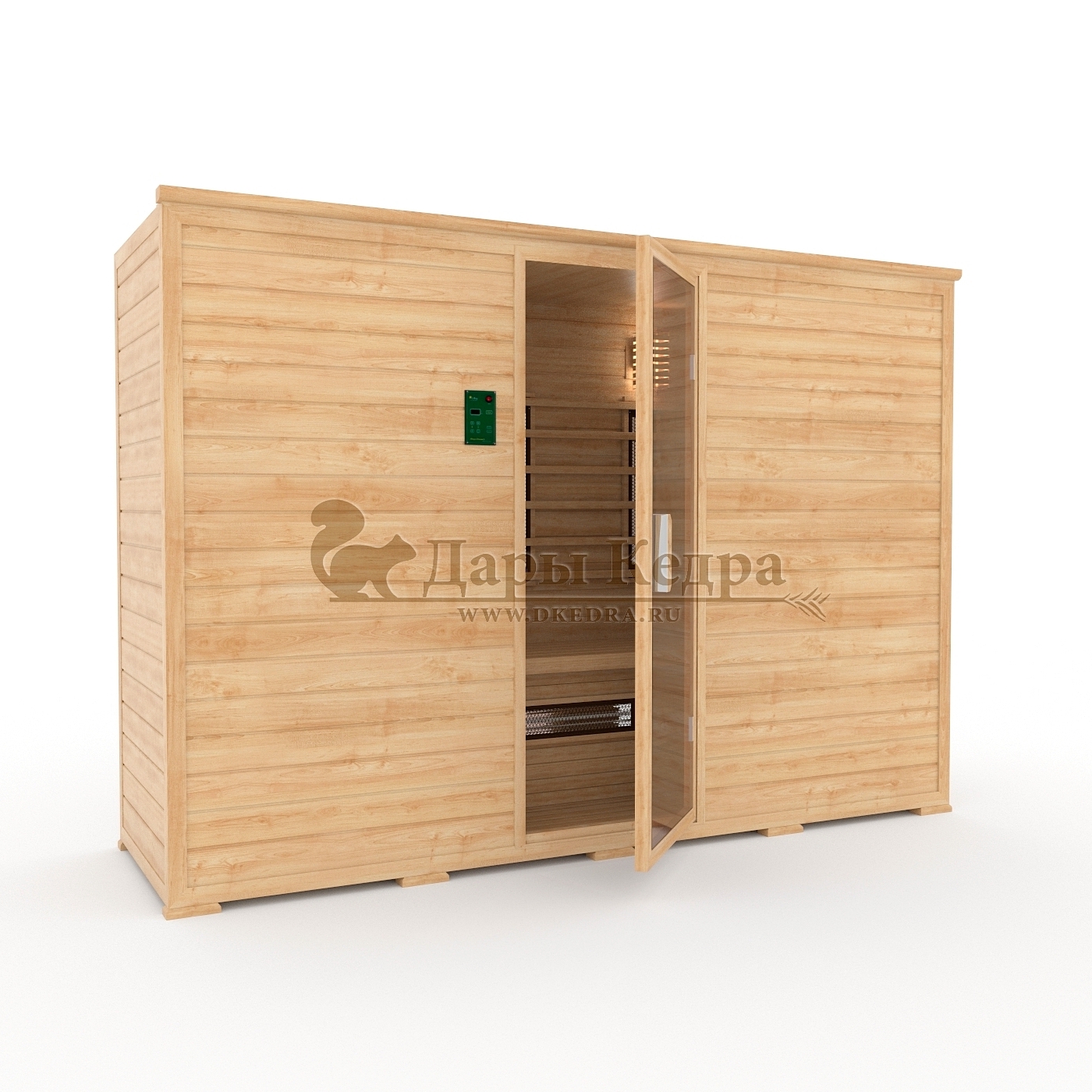 Это специально оборудованная кедровая кабина для прогрева тела человека сухим теплом. Воздух в таких парных не нагревается. Инфракрасные лучи воздействуют на тело, равномерно прогревая мышцы, суставы и органы. Керамические излучатели похожи на лампы, имеют высокую температуру нагрева, поэтому защищены противоожоговыми решетками. Тело человека в таких саунах нагревается интенсивнее. Работает кабина за счет электричества. Вместительная пятиместная инфракрасная сауна с керамическими излучателями подойдет для коммерческого использования.
